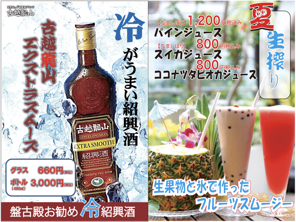 4. 盤古茶屋(ばんこちゃや)夏のお勧めドリンク!!! ●中国料理といえば紹興酒 <呑み方はロックがお勧め>古越龍山エクストラスムーズ グラス¥660-,ボトル¥3,000- ●食後のデザートやお口直しに 生搾りフルーツスムージーパイン¥1,200- 生搾りフルーツスムージースイカ¥800- ココナッツタピオカジュース¥800-